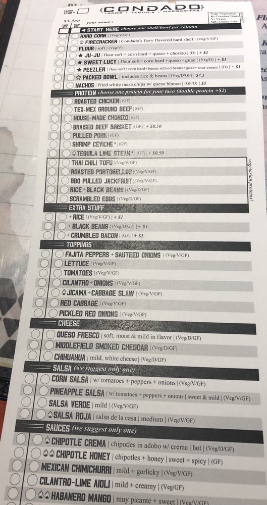 Condado's menu boasts an array of customizable tacos, including their popular Crispy Taco Crunch Box, featuring hard shell tacos filled with your choice of protein and topped with fresh ingredients. The Build Your Own Nachos are another highlight, showcasing housemade chips with various toppings that tantalize the palate.
